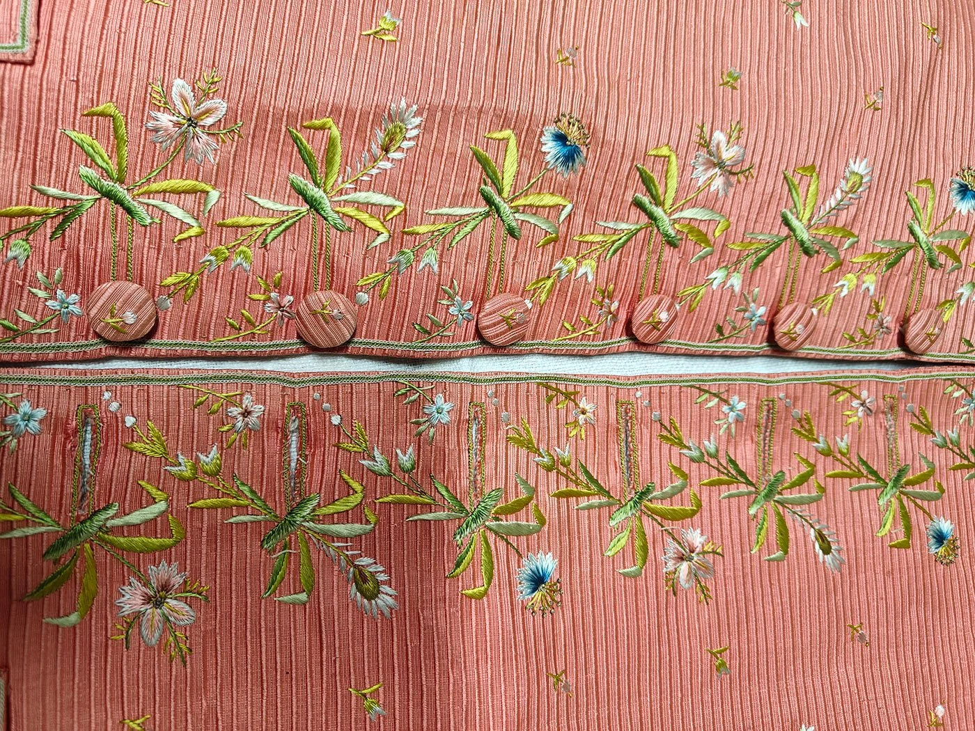 1700-talets dam- och herrkläder dekorerades ofta med broderi. Detta kunde förekomma som bårder eller täcka hela plagget, med silke och metalltråd applicerade separat eller tillsammans för en spektakulär effekt. Stilarna förändrades under seklet, och nya tekniker utvecklades kontinuerligt.